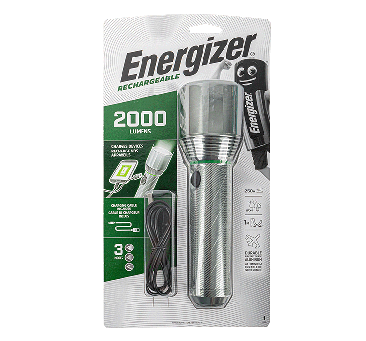 Energizer® Rechargeable Metal Flashlight 2000 Delivers high-performance innovation with exceptional light output for any task with Latest LED technology delivers maximum brightness. This product is easy to use, durable and dependable and a great tool for DIY projects and work tasks. It Operates on a non-removable 21700mAh 3.7V Lithium Ion battery and features both USB-in and USB-out ports. It has a wide powerful beam, uniform light output with natural daylight colour with Three light modes: high, low and strobe it has a press and hold function for one-handed Digital Focusing and a three press to activate the 4.25hz strobe light.