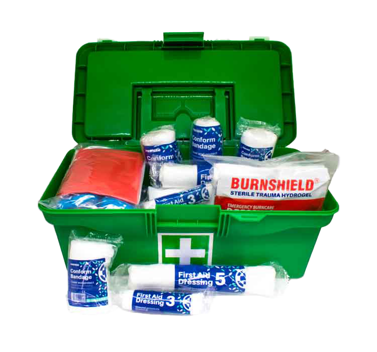 • Contents: [‘1 x Burnshield dressing 100x100mm’, ‘2 x Proform bandage 75mm’, ‘2 x Proform bandage 100mm’, ‘2 x FAD No.3 (75x100mm)’, ‘2 x FAD No.5 (150x200mm)’, ‘2 x Triangular bandage – non woven’, “2 x Progauze swabs sterile (100x100mm) 5’s”, “1 x Progauze swabs non-sterile (75x75mm) 5’s”, ’10 x Plaster strips’, ‘1 x Profab fabric roll (25mmx3m)’, ‘1 x Hypopore paper tape (24mmx3m)’, ‘2 x Levtex medium pair of gloves’, ‘2 x Levtex large pair of gloves’, ‘1 x cotton wool 100g’, ‘1 x First aid scirrors (metal)’, “1 x Safety pins (12’s)”, ‘2 x Splints’, ‘2 x CPR mouthpiece’, ‘1 x Antiseptic wound cleaner 50ml’, ‘SPILL KIT’, “1 x Progauze swabs non-sterile (75x75mm) 25’s”, ‘4 x Nitrile pair of gloves’, ‘1 x Red hazardous waste bag’, ‘4 x Paper towels’, ‘2 x Antiseptic granules’]