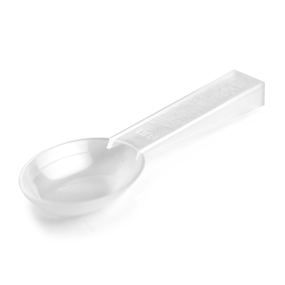 Medicine measuring spoon 5ml dose size graduations for accurate measurement of liquids.